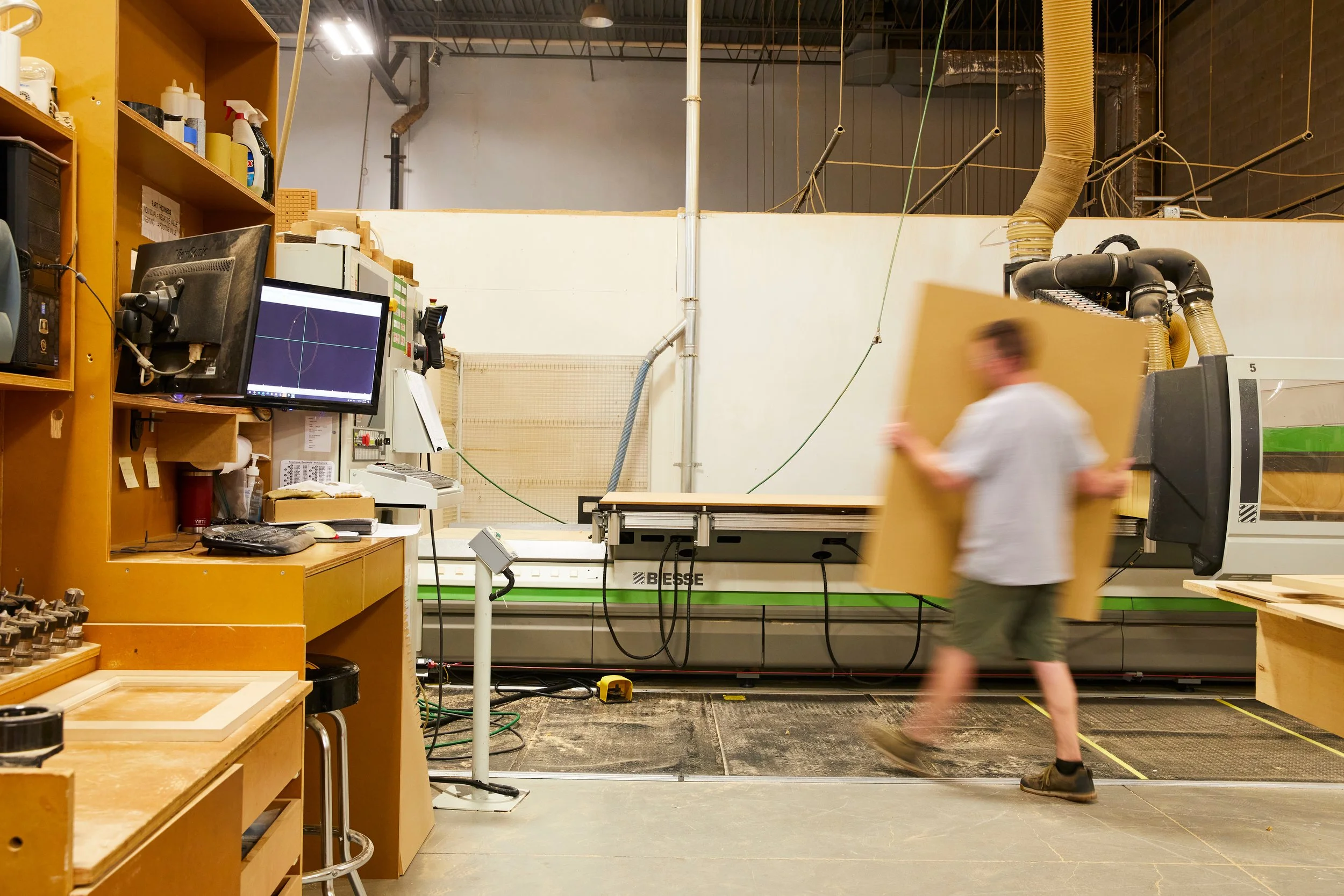 A person walking inside a woodworking shop carrying a large piece of wood, with woodworking machines and equipment around.